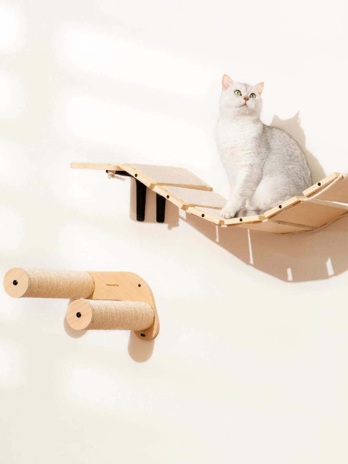 • Adjustable Cat Bridge: This stylish new wall mounted cat furniture consists of a bridge and two cat platforms. The length of the suspension bridge, the number of wooden boards, and the spacing can be adjusted according to your needs, allowing your feline friend to play and run freely on top